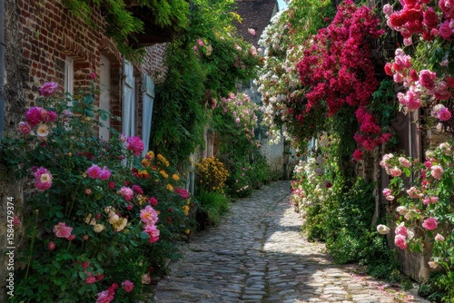 Colorful fragrant roses bloom in the narrow streets of the small village of Gerberoy Normandy during summer