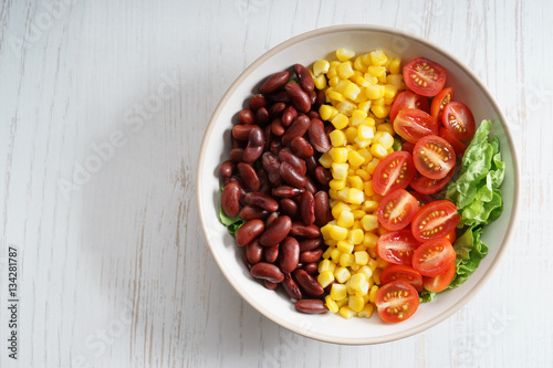 salad, vegetable, healthy, bean, corn, tomatoes, red, yellow, fresh, cabbage, green, food, vegan, sliced, bowl, dressing, lettuce, delicious, snack, tasty, ingredient, nourishment, raw, appetising, cherry tomato, colours, organic, meal, vitamin, nature, season, diet, southwestern, sweet, overhead, topview, copy space