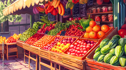 Colorful Fruit and Vegetable Market Display in Bright Atmosphere
