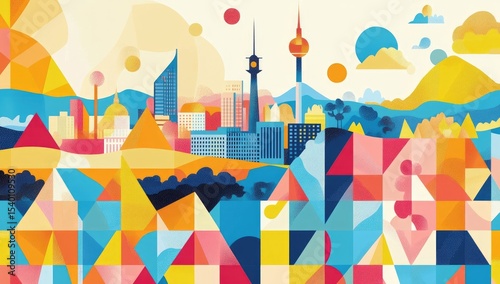 city landscape, geometric, colourful, abstract, panorama, modern, urban, landscape, mountain, hill, building, skyscraper, tower, planet, cloud, shape, triangle, square, polygon, design, illustration, art, vibrant, pastel, warm, cool, yellow, blue, orange, red, pink, green, nature, desert, pyramid, tree, vegetation, background, flat, digital, pattern, composition, futuristic, city, horizon, style, contemporary, poster, artwork