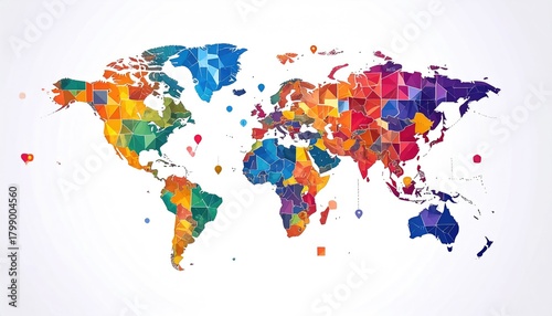 Colorful, geometric world map with fragmented continents, using varied hues, accented by location pins over a white background
