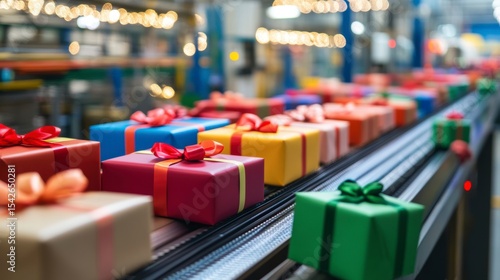 gift, present, factory, production, manufacturing, industry, conveyer, belt, line, assembly, process, cardboard box, wrapping, ribbon, bow, colourful, colours, vibrant, bright, holiday, celebration, festive, christmas, birthday, surprise, happy, joy, happiness, shipment, delivery, transport, logistic, commerce, business, marketing, retail, sale, purchase, consumer, good, product, merchandise, item, object, box, carton, massa, scale, automation