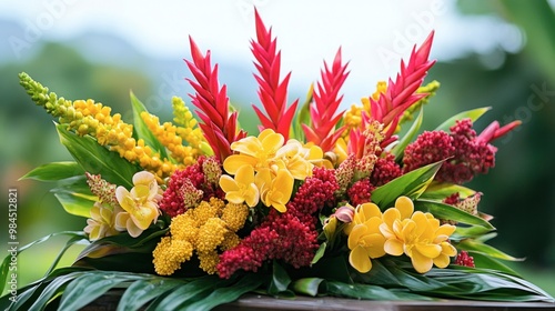 Colorful ginger flowers in a decorative arrangement, adding tropical flair to a summer wedding.