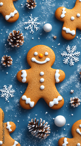 gingerbread, cookie, icing, blue background, festive, decoration, snowflake, pine cone, baking, winter, dessert, holiday, sweet, treat, hand-made, celebration, traditional, cheerful, seasonal, sugar, spice, confectionery, decorative, culinary, childhood, aroma, cosy, winter landscape, party, tasty, favor, joy, tradition, creativity, kitchen, deliciously, homemade