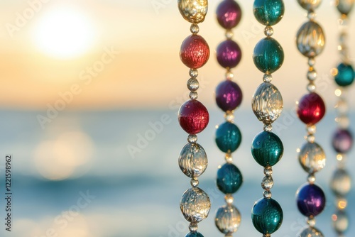 Colorful glass beads hang against a blurred sunset ocean backdrop, creating a serene and beautiful scene.