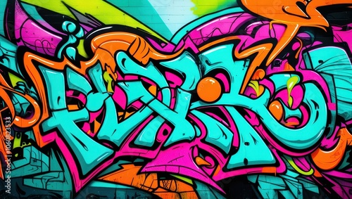 Colorful graffiti art, vibrant street mural, wildstyle lettering, neon colors, abstract urban design, spray paint texture, dynamic curves and arrows, intricate overlapping shapes, psychedelic color pa