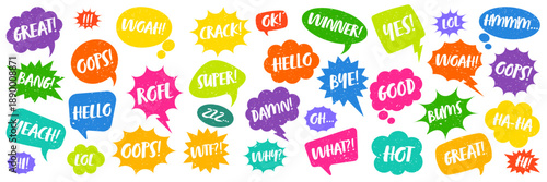 Colorful grunge comic speech bubbles with handwritten text. Hand drawn retro cartoon stickers. Chatting, message box. Vector illustration