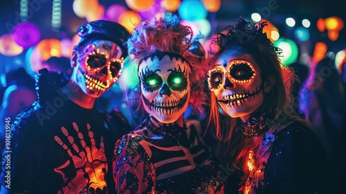 colourful, halloween, costume, glowing, light, neon, party, celebration, skittish, festive, make-up, decoration, atmosphere, creativity, nightlife, art, night, event, fun, excitement, energy, unique, vibrant, eerie, playfulness, mask, photo, social, togetherness, joy, gathering, culture, tradition, expression, originality, allure, youth, fantasy, optical, charme, style, spirit, life events, imagination, artistic