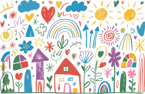 doodle, drawing, illustration, pattern, background, colourful, house, flower, rainbow, cloud, nubes, sun, star, arrow, tree, leaf, cute, childlike, whimsical, art, design, vector, vignetting, scribble, element, decoration, graphic, artwork, cartoon, clip art, children, children, happy, bright, fun, spring, summer, nature, sky, plant, home, love, optimistic, positive, cheerful