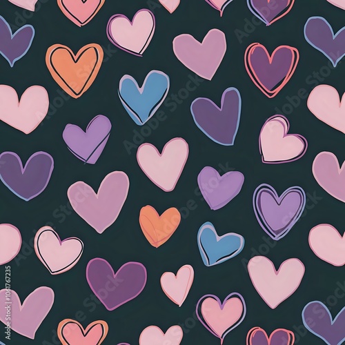 dark background, vibrant, pink, red, purple, light blue, love, romance, february 14, playful, pattern, scattered, romantic, celebration, decorative