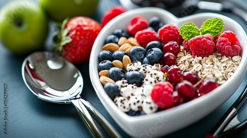 Colorful Heart-Shaped Bowl Filled with Fresh Berries, Nuts, Oats, and Mint Leaves for a Healthy Breakfast or Snack