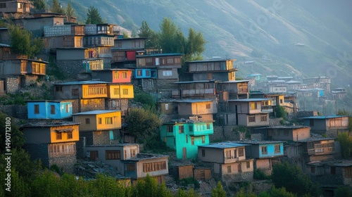 house, hillside, village, colourful, architecture, mountain, nature, landscape, rural, sunlight, wooden, window, vibrant, community, dwelling, serene, scenic, environment, tour tourism, travel, photo, peaceful, sky, structure, field, rural area, daylight, scenery, habitat, living, contrast, artistic, view, calmness, residential, design, eaves, natural beauty, altitude, building, slope, summer, remote