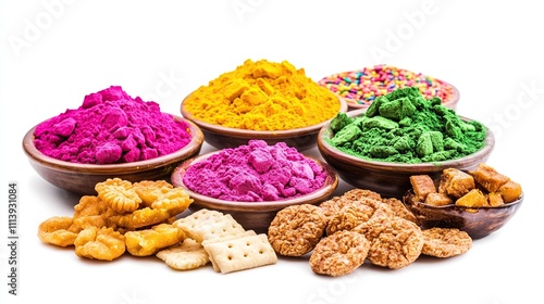 holi, festival, powder, colours, celebration, india, culture, tradition, spring, joy, happy, fun, vibrant, bright, colourful, powdered, pigment, dye, food, sweet, snack, biscuit, cookie, treat, delicious, tasty, holiday, religious, ritual, event, party, celebratory, background, isolated, white, studio, photo, image, picture, design