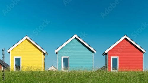 Colorful Houses on a Sunny Day - Three brightly colored houses sit on a grassy hill against a clear blue sky. Perfect for real estate, home, and happiness concepts