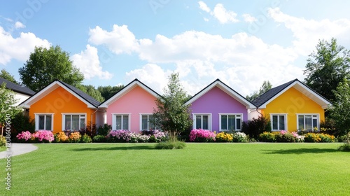 Colorful houses, sunny day, green lawn, residential area, real estate