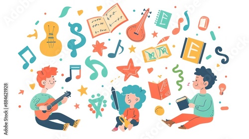 music, illustration, children, learning, reading, book, guitar, play, joyful, creative, education, art, fun, happy, children, student, school, cognition, instrument, musical, note, melody, rythm, literature, story, imagination, colourful, bright, cute, cartoon, draw, design, graphic, vector, clip