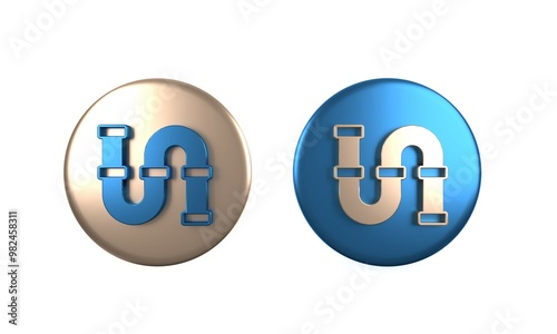 Colorful Industry metallic pipe icon isolated on white background. Plumbing pipeline parts of different shapes. Circle button. 3D render illustration
