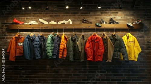 jacket, shoe, wall, brick, colourful, clothing, apparel, fashion, retail, display, store, shop, winter, autumn, spring, style, outerwear, garment, collection, assorted, variety, vibrant, warm, cosy, comfortable, trendy, modern, rustic, interior, design, wood, shelf, hanging, hanger, footwear, boot, sneaker, heel, leather, textile, texture, background, space, commercial, business, sale