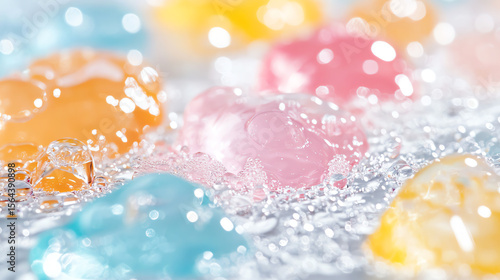Colorful jelly candies floating in clear water, capturing a refreshing and playful moment with vibrant hues and a fun texture.