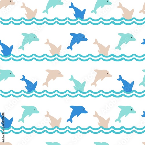 Colorful Jumping Dolphins Family Cute Vector Cartoon Seamless Pattern