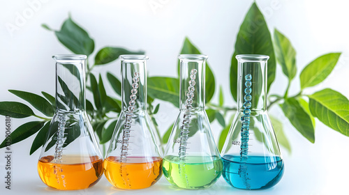 Colorful Laboratory Flasks with Plants Representing Science and Nature. Flasks with vibrant liquids symbolizing scientific research and environmental sustainability