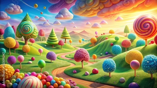 Colorful landscape with rolling hills and gumdrop-shaped trees in a sugary sweet environment, bright landscape, food themed landscape