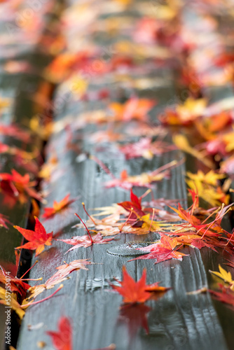 Colorful leaves on an outdoor bench, closeup. Autumn park.