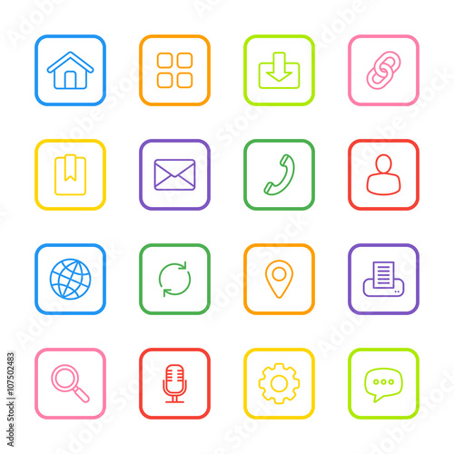 line, icon, set, vector, illustration, web, infographic, mobile, home, menu, download, link, bookmark, electronic mail, phone, user, account, login, globe, earth, refresh, reload, pin, location, address, printer, search, magnifier, microphone, gear, setting, configuration, chat, frame, rounded, rectangle, colourful
