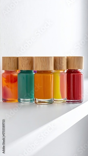 jar, liquid, colours, bottle, wooden, lid, glasses, orange, green, yellow, red, pink, hue, vibrant, bright, sunshine, illumination, light, shadow, white, shelf, row, display, colourful, art, paint, pigment, solution, extract, essence, dye, collection, assortment, array, spectrum, variety, organic, natural, simple, minimal, still, life, product, decoration, design, studio, aesthetic, clear