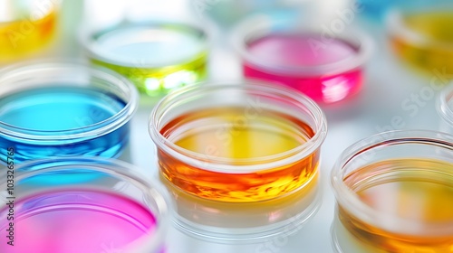liquid, colours, glasses, petri, dish, blue, yellow, orange, pink, red, green, scientific, laboratory, experiment, research, chemical, science, laboratory, sample, solution, mixture, container, analysis, transparent, bright, vibrant, clear, surface, white, background