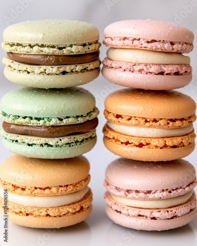 Colorful macarons stacked in rows