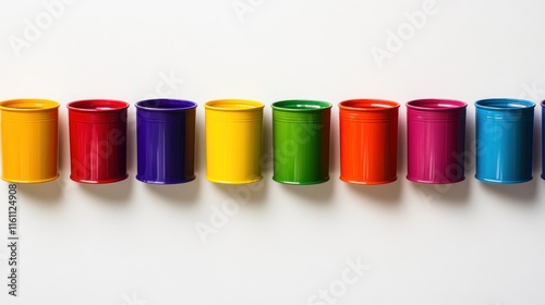 Colorful Metal Cups Arranged in Rainbow Row Against White Background
