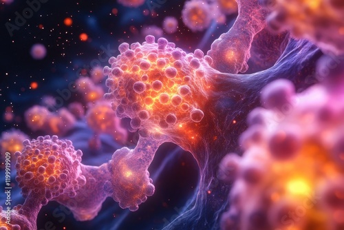 Colorful microscopic view of cell structures and molecular processes in a biological setting