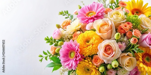 Colorful mixed floral arrangement against soft white background with pastel shades of pink yellow orange and green, colorful flowers, nature scene