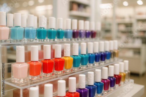 Colorful Nail Polish Bottles Displayed in Beauty Store Interior
