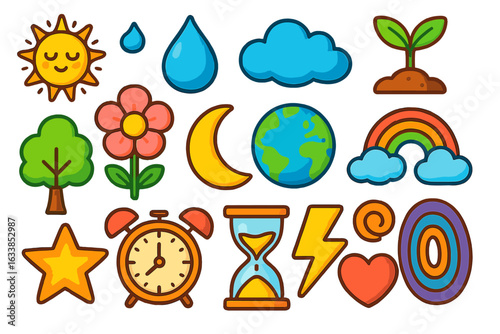 nature, weather, icon, cartoon, sun, cloud, rain, rainbow, moon, earth, globe, flower, plant, tree, star, clock, alarm, hourglass, time, lightning, nubes, symbol, doodle, cute, colourful, element, outdoors, climate, sky, environment, ecology, vector, illustration, set, hand-drawn, children, education, happy, day, night, landscape, graphic, clip art