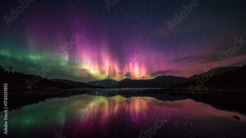 aurora, borealis, light, night, sky, landscape, water, mountain, purple, green, pink, star, nature, calm, tranquil, serene, beautiful, marvellously, colourful, vibrant, magical, aethereal, dark, stillness, horizon, coast, scene, outdoors, majestic, brilliant, atmospheric, cosmic, universe, earth, glow, radiance, energy, flow, phenomena, display, spectacular, amazing, captivating, deep, mysterious, undisturbed, evening