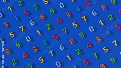 Colorful number pattern. Blue background. Abstract illustration, 3d render.