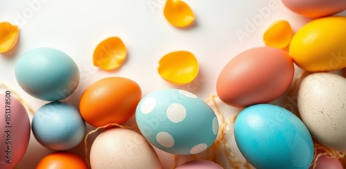 Colorful painted Easter eggs and yellow flower petals arranged on a white background. Flat lay composition for holiday design