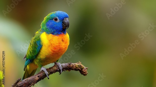 Colorful parrot on branch; blurred green background. Perched, alert.