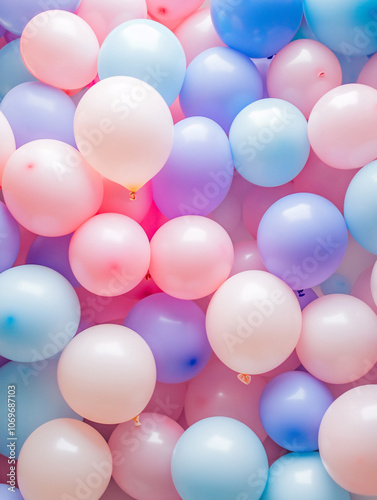 Colorful party balloons background collage, set. Celebration, holidays, summer concept. Design template. Billboard blank, top view, copy space.