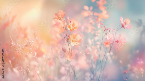 Colorful pastel flowers in a meadow, spring wildflowers, pastel background, ample copy space for text, for cosmetics, spa, perfume, beauty salon, florist shop.