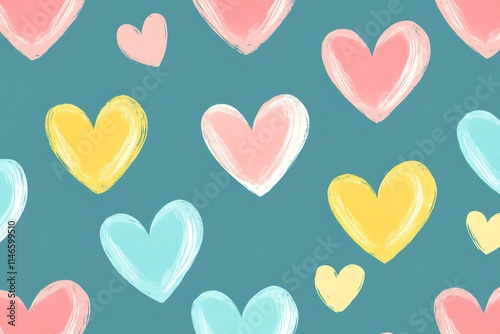 Colorful pastel heart shapes creating seamless pattern on teal background