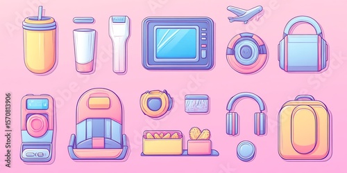 contraption, technology, accessory, pastel, colourful, modern, playful, pink, background, digital, camera, earphones, suitcase, drink, bottle, smartphone, tablet, aeroplane, charger, case, billfold, storage, electronic, travel, lifestyle, tech, portable, compact, design, vector, illustration, flat, icon