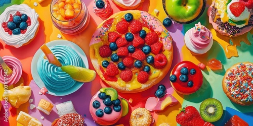 Colorful pastries and fruit on a vibrant background.