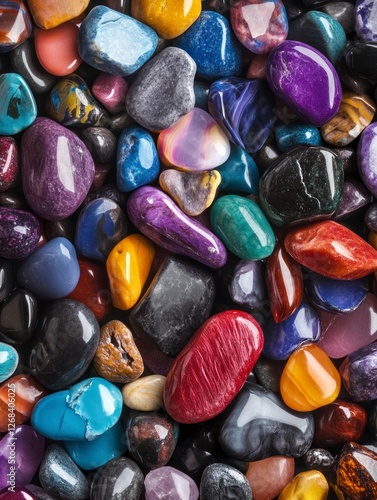 Colorful pebbles and rocks background, top view. Background of colorful stones. Shallow depth of field. High resolution.