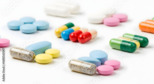 Colorful Pills: A collection of vividly colored pills, capsules, and tablets, offering a visual representation of health, medicine, and pharmaceutical options.