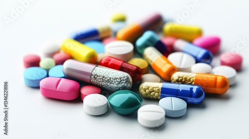 Colorful pills and tablets in various shapes, including round or square-shaped tablets and capsules, on a white background.
