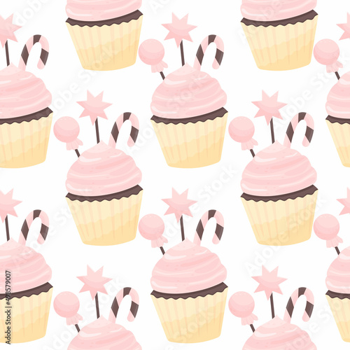 Colorful pink cup cake seamless pattern. Tasty dessert repeatable print. Vector illustration on white background.