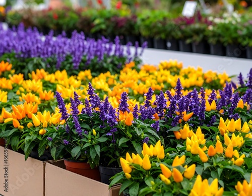 plant, flower, row, pepper, lavandula, yellow, purple, green, pot, garden, market, bright, fresh, colourful, organic, closeup, arrangement, display, indoor, exterior, beauty, vibrant, nature, spring, summer, growing, detail, garden center, agriculture